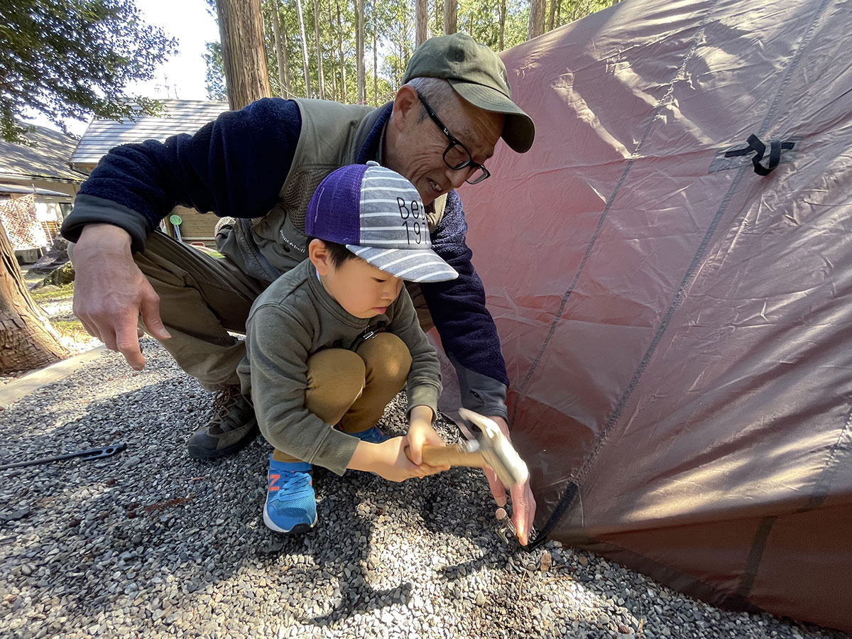 ハンマーでペグを打つ、ロープを使ってテントを固定する…。キャンプで使用する道具に触れながら、実際にみんなでワンポールテントなどの設営をします。
