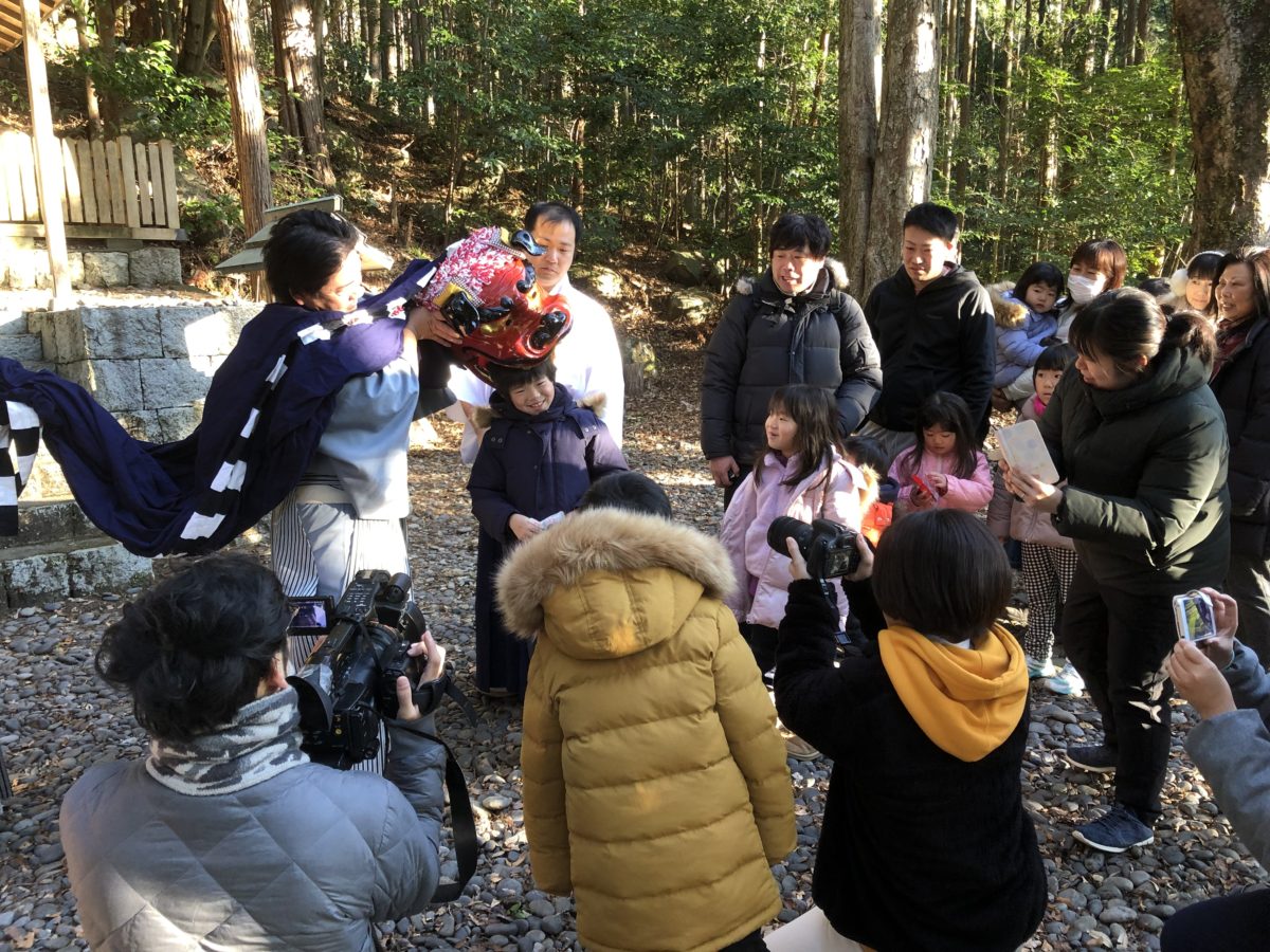 日の出のあとは、便ノ山神社に移動し便ノ山神楽鑑賞。お獅子に頭を噛んでもらうと、無病息災・学力向上などご利益があると伝えられています。