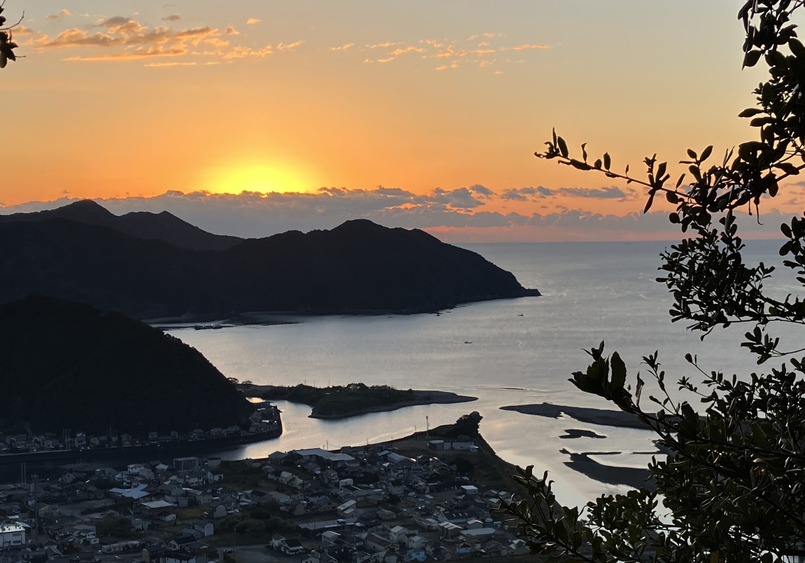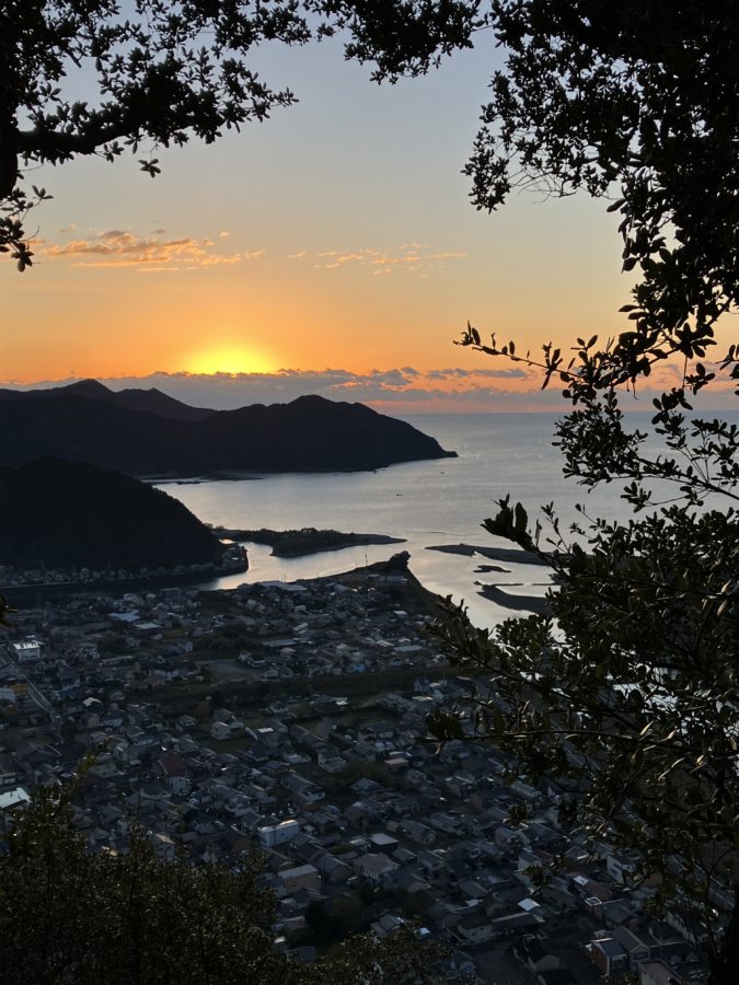 鳥居越しに見る銚子川、熊野灘、相賀の街並み….そして日の出!特別なお正月をお過ごしください。
